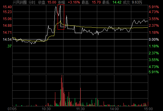 如图3所示,这是兴民钢圈(002355)在7月5日中上演的“一刀断魂”。砸盘后吸引散户跟风买入的痕迹非常明显。这种买卖方式是徐翔的拿手操盘功夫
