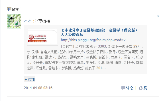 注:帮助人大经济论坛推广,复制贴子内容(带人大经济论坛网址)并发到其他论坛和网站;或点击贴子标题后的“推广有奖”,把本贴推荐到QQ群或自己的微博(最好@人大经济论坛),然后跟贴贴出链接或截图,证明已作推广的,将获得如下论坛币的奖励!