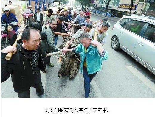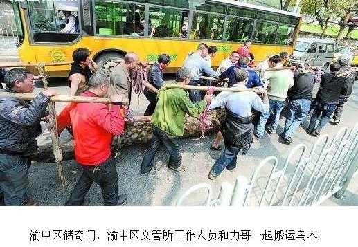 “千年碳化为阴沉,长年水下水沉木,皆是良材好树木,多年岁月灵性足。”这是古书中对乌木的描述。昨日中午,渝中区储奇门,20名力哥抬着一根5.8米长的乌木穿行在车流中,惹来不少市民围观。