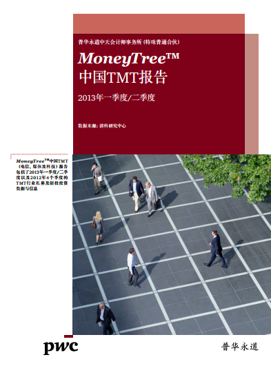 普华永道中国最近首次出版了MoneyTree™报告。这是一份聚焦于私募及创投基金在中国TMT(电信、媒体和科技)行业的投资现状和趋势的季度研究报告。考虑到TMT行业近几年在中国的迅猛发展,而各大私募及创投基金在这一领域的投资随着宏观经济大气候及投资环境的变化跌宕起伏,为此普华永道中国将于2013年起定期出版MoneyTree™报告。
