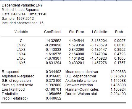 相关系数表里 LNX2 LNX4;LNX4 LNX5; LNX5 LNX2这三组的相关系数很高(LNX6与LNX2 LNX4 LNX5)也偏高,建议逐步回归剔除掉一些变量,再看看检验结果。