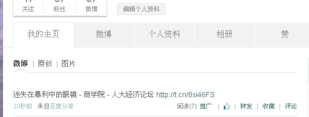 注:帮助人大经济论坛推广,复制贴子内容(带人大经济论坛网址)并发到其他论坛和网站;或点击贴子标题后的“推广有奖”,把本贴推荐到QQ群或自己的微博(最好@人大经济论坛),然后跟贴贴出链接或截图,证明已作推广的,将获得如下论坛币的奖励!活动已结束。