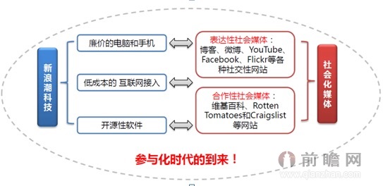 新浪潮科技(帮助个体和群体保持互联互动的科技)的出现标志着参与化时代的到来。在参与化时代中,人们在消费新闻、观点和娱乐的同时也主动创造它们。新浪潮科技使得人们从被动的消费者变成了产销者(生产型消费者)。社会化媒体又称为社交媒体,社交媒体的快速发展,是参与化社会来临的必然结果。