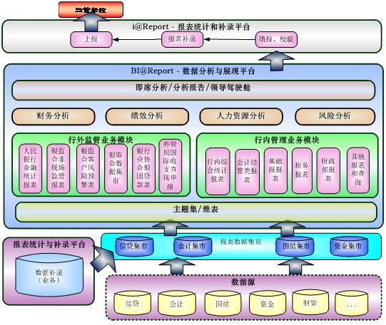 银行综合报表平台方案涵盖了银行业对外监管报送、行内综合统计、财务分析、绩效考评、人力资源管理、客户风险管理等全业务的内外部管理要求。通过报表数据集市、数据抽取、数据补录、报表补录、数据报送、多维分析、预测预警、门户展示等技术手段,并融合多年的银行综合报表统计成功实施经验,旨在提升外部监管报表报送的质量和效率,保障行内综合统计分析和风险防范的及时有效,结合大量数理统计模型和数据挖掘模型为决策者提供决策依据。