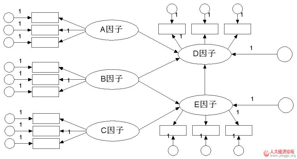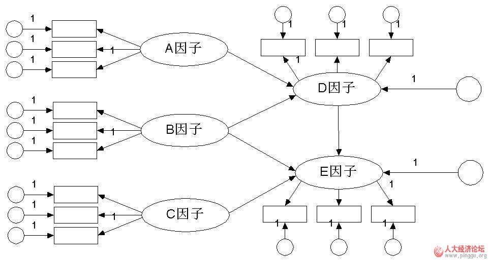 问一个基本问题: 问卷中含有5个因子(A, B, C, D, E), 每个因子的测量是用已经开发出的问题(比如因子A是用5个题目, 因子B是用3个题目, 这些因子都是单纬)。 理论模型:A-->D, B-->D, B-->E. C-->E, 若要用AMOS进行验证因子分析,做测量模型,是否是将5个因子并排列好, 然后两两相关的划线?