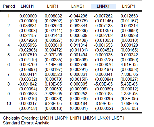 做VAR模型的时候脉冲这个表格怎么看啊 我想求权重就是不知道括号里面的数是什么意思 没有括号的数字又是什么?求解答 谢谢你们了 积极发言吧