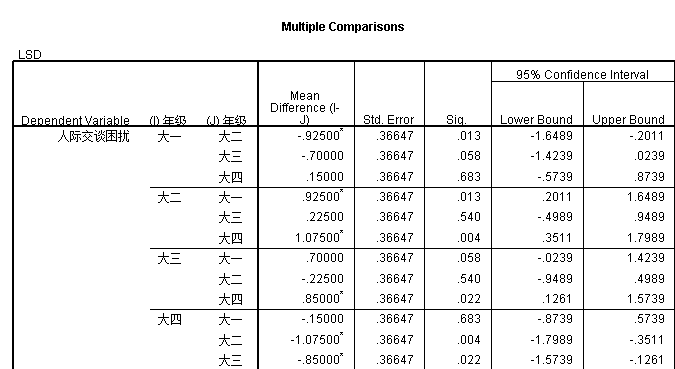 如图 从这里面的数据可以看出来在人际交谈困扰方面 大一的得分显著小于大二的吗?