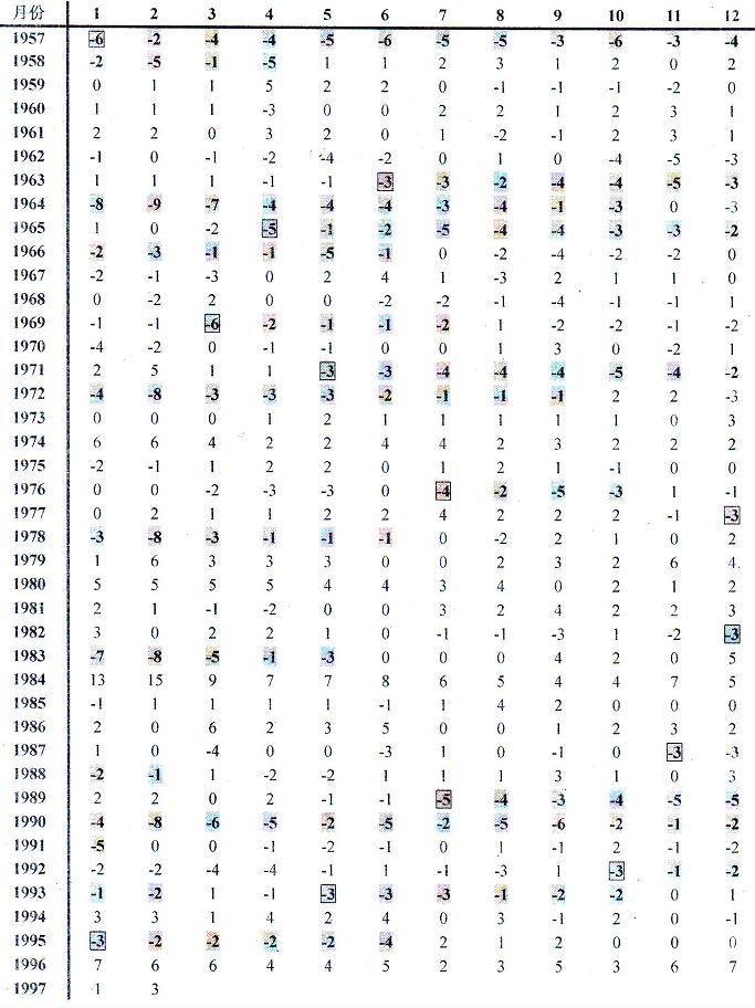 显然从表21.3-2依然看不出它与厄尔尼诺现象有任何关系。虽然地转减慢过程中季节性的不均匀性变化规律明显,但笔者更关心那种规律性不明显的不均匀性。我们将表21.3-2的资料再处理一下,过滤掉这些以年度为周期的季节性变化,看看情况如何。将表21.3-2的资料进行12个月的滑动平均,滤掉年度的季节性变化,最后便得到表21.3-3。显然表21.3-3就没那么有规律了。可是,在无明显规律可见之中所隐含的规律,可能才是更有用的规律。除去了季节性的正常加速和减速之后,表21.3-3中的负值就是地球自转的非正常减速,正值是非正常加速。细分析之后我们做出如下规定:凡出现≤-3即视为较明显的非正常减速,如果随其后又连续出现负值共达4个月者,便计为一个非正常减速过程,打头的月份即为过程的开始月份。由此,一个个非正常减速过程──地转速度突减过程,就跃然表中了。对过程的开始月份予以统计,显见从1957~1996年共出现了下列13次地转速度突减过程: