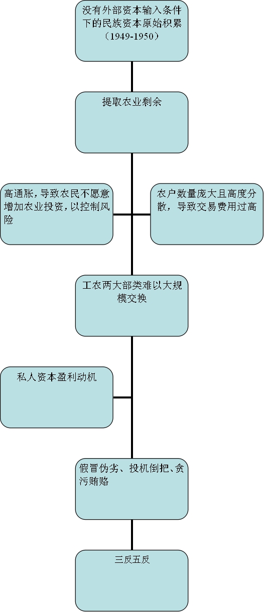 基于上述原因,建国初期,城市支农工业品难以进入农村市场,而当时农民占总人口的80%以上,从而导致城市工业品滞销。城市资本家为了维持经营,不得不采取资本主义原始积累阶段一切肮脏、下流的手段:假冒伪劣、投机倒把、贿赂官员。当时,刚进城的大量共产党“泥腿子”干部都禁不住这糖衣炮弹的进攻,于是,挟革命余威的各地政府发起了以反对国家干部贪污受贿和资本家行贿、偷工减料为主的“三反五反”运动。
