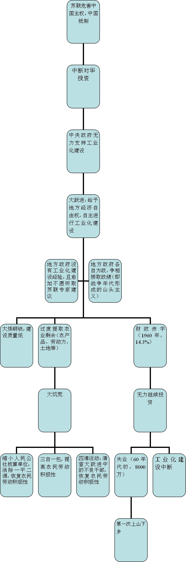 既然中国不再跟从苏联,于是,从1957年起,苏联逐步中断对华投资,其直接表现就是中央政府财政收入占全国财政收入比重由1958年的80.4%下降到1959年的24.4%,经由苏联专家协助制定的二五计划胎死腹中。任何处于原始积累阶段的国家如果遭遇投资中断都会出现整体的经济危机和社会危机:投资中断——追加投入不足——企业倒闭——大规模失业——社会动荡乃至崩溃。