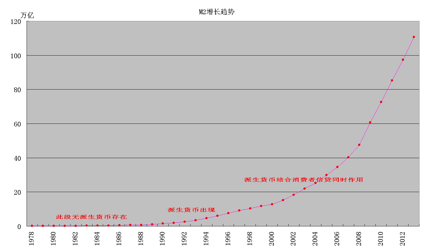 同时"无派生货币","派生货币出现""派生货币+消费者信贷出现"三个不同时期的M2增长趋势一目了然.