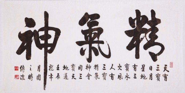 作品描述:人们常说:“天有三宝日、月、星;地有三宝水、火、风;人有三宝神、气、精。”“精、气、神”是一种精神,永不言败的精神;是一种蓬勃向上的朝气;是一种坚韧不拨的意志;是一种时不我待的劲头;是一种奋力拼搏的力量;是一种积极奉献的执着。此幅作品适合长期投资与收藏,也可以作为高档礼品赠予领导或者长辈。