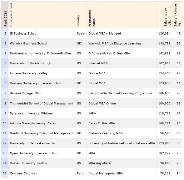 英国《金融时报》(Financial Times)2014年首个在线MBA项目排行榜近日公布,有来自4个国家的15所商学院进入了该榜单。西班牙IE商学院(IE Business School)的“Global MBA Blended”项目荣膺榜首。英国华威商学院(Warwick Business School)和美国东北大学(Northeastern University)达莫尔-麦金商学院(DAmore-McKim School of Business)分列榜单的第2、第3位。