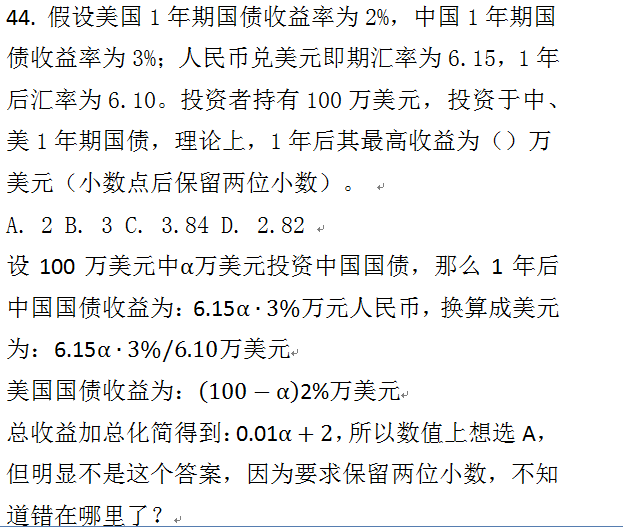 我是想选D的。按照远期汇率公式算出1年期远期汇率理论价格是6.3076。投资哪国收益更大是跟投资者对市场的预期跟判断有关,如果投资者认为1年以后美元更值钱,自然现在会投资美国市场,如果认为1年以后人民币更值钱,自然现在会投资中国市场。不知道这个题目里面6.3这个数据是拿来干嘛用的。混淆视听吗??小伙伴们有何看法。
