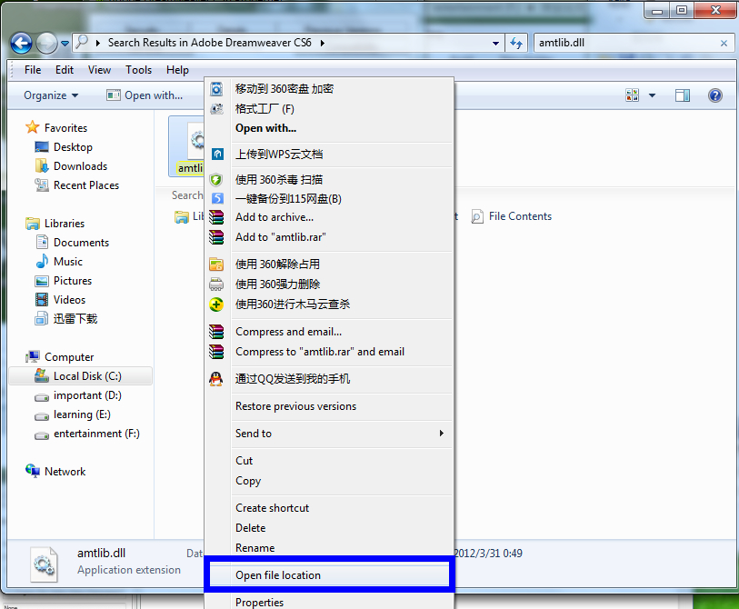 第二步:找到你的安装文件(比如一般在C:\Program Files\Adobe\Adobe Dreamweaver CS6),win7也可以通过下面的方法找到: