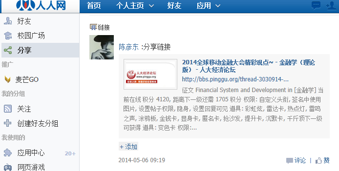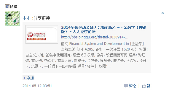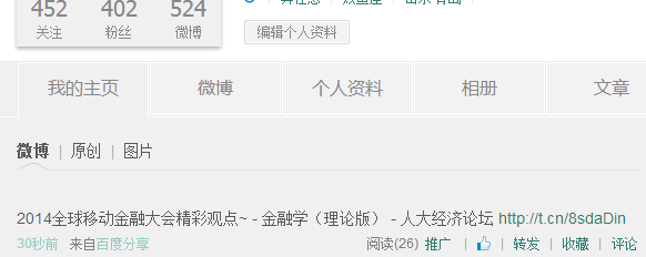 帮助人大经济论坛推广,复制贴子内容(带人大经济论坛网址)并发到其他论坛和网站;或点击贴子标题后的“推广有奖”,把本贴推荐到QQ群或自己的微博(最好@人大经济论坛),然后跟贴贴出链接或截图,证明已作推广的,将获得如下论坛币的奖励!(大家一定要把群现有人数或微博粉丝人数截屏出来哦~不然只能奖励10个币哦)