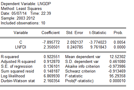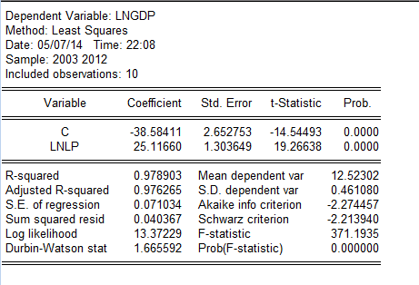 从下面看图片的出的结果LNFDI每增加1%,LNGDP就增加2.350501%,LNLP增加1%,LNGDP就增加25.11660%,有没有太夸张了,各位我是不那里弄错了?请指教一下,谢谢!