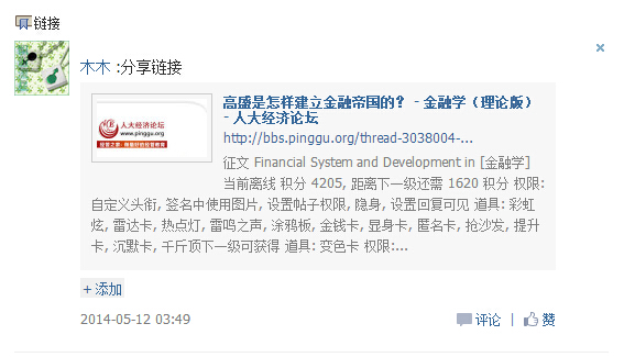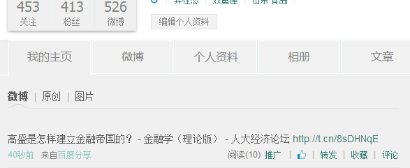 帮助人大经济论坛推广,复制贴子内容(带人大经济论坛网址)并发到其他论坛和网站;或点击贴子标题后的“推广有奖”,把本贴推荐到QQ群或自己的微博(最好@人大经济论坛),然后跟贴贴出链接或截图,证明已作推广的,将获得如下论坛币的奖励!(大家一定要把群现有人数或微博粉丝人数截屏出来哦~不然只能奖励10个币哦)