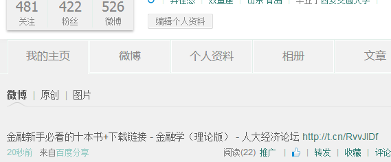 帮助人大经济论坛推广,复制贴子内容(带人大经济论坛网址)并发到其他论坛和网站;或点击贴子标题后的“推广有奖”,把本贴推荐到QQ群或自己的微博(最好@人大经济论坛),然后跟贴贴出链接或截图,证明已作推广的,将获得如下论坛币的奖励!(大家一定要把群现有人数或微博粉丝人数截屏出来哦~不然只能奖励10个币哦)