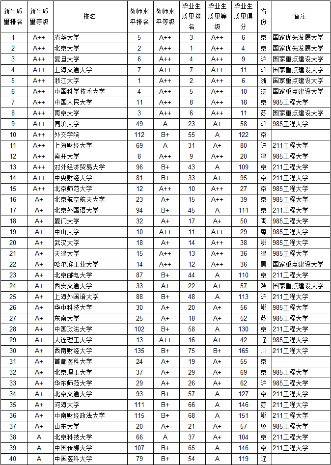在下表的新生质量、教师水平、毕业生质量对照排行榜中,凡等级在C级及以上的,列出排名和等级,D+级及以下的只列等级,不列排名,等级相同,排名不分先后。其中的毕业生质量得分,是新生质量排名和教师水平排名相加之和,毕业生质量得分相同的,按教师水平排名排列。