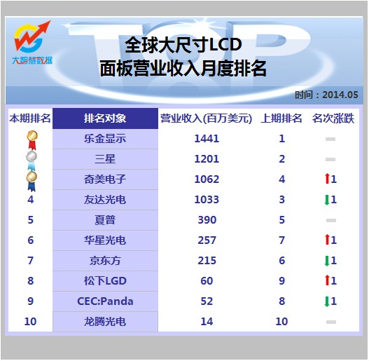数据显示最新一期的全球大尺寸LCD面板企业营业收入排名,乐金显示继续排名第一,总营业收入达到14.41亿美元,三星排名第二,奇美电子超越友达光电排名第三。