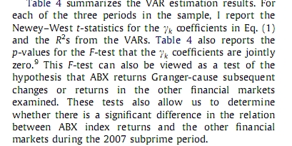 这个是回归结果,我就这里看不懂:This table reports the Newey–West t-statistics for the indicated coefficients from the estimation of the VAR specification shown below, where each VAR is estimated separately for the indicated year. Also reported is the p-value for the F-test of the hypothesis that 伽马r1=r2=r3=r4= 0(就是公式的ABX之前的系数伽马打不出来rk). In this specification, Y denotes the financial market variable that appears as the dependent variable while ABX denotes the ABX。