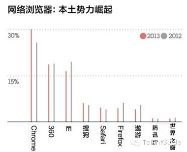微软新系统和平板的平庸表现加剧了IE的失势,自主安装浏览器的调查对象中,选择Chrome的比例大幅提升。而中国浏览器品牌中表现最好的360和搜狗已经成为1/4公司人的首选,两款产品中,一个背靠国内最流行的安全软件,另一个则跟着占有率最高的中文输入法,通过巧妙的设计让很多用户在不经意间用上自家浏览器。