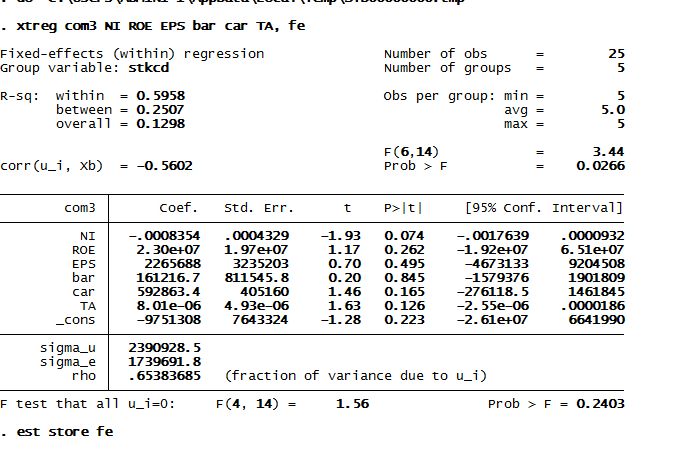 在做hausman检验时,分别用随机模型和固定效应模型回归时。我做的随机效应模型的结果显示如下:没有常规的最后一行的F检验呢?[img]file:///C:\Users\Administrator\Documents\Tencent Files\534009816\Image\VH4EPBBYDV78FI7[PP0BO}3.jpg[/img]
