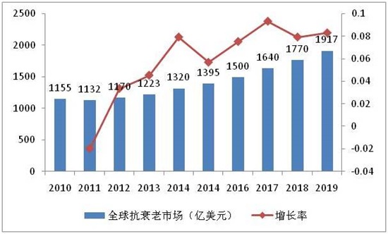 根据《中国美容业市场调查报告》显示,目前女性最关心、最热门的保养服务项目“抗衰老保养”在所有项目中的提及率高达72.2%。不论是内服的中药、保健品,还是外敷的护肤品或是整形技术,都成为市场上的热销产品。根据国际研究机构Global Industry Analysts与Transparency Market Research的研究数据,2010年全球抗衰老产品销售额超过1,000亿美元,2013达到1223亿美元,预计到2019年全球抗衰老市场销售将达到1,917亿美元,期间年复合增长率约为7.8%。
