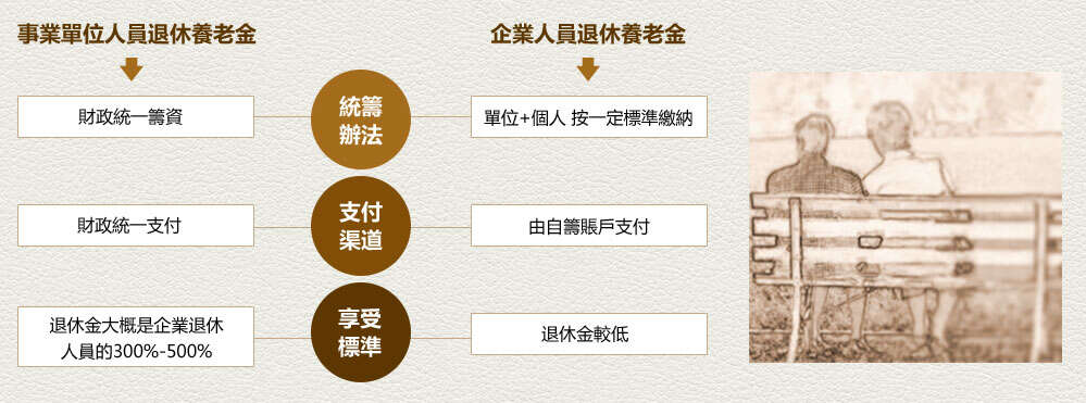 中國養老金主要分為兩類:事業單位人員退休養老金和企業人員退休養老金。二者實行不同制度,被輿論廣泛稱為養老「雙軌制」, 兩者待遇差距巨大,歷來受到人們詬病,但已在中國存在超過20年。