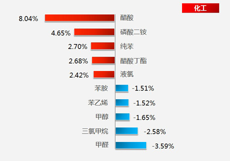 本周大宗商品市场整体跌多涨少,农业行业前期涨幅突出的鸡蛋、鸡肉价格都开始回落,钢铁有色行业部分品种有所表现,热轧卷板、螺纹钢等反弹迹象明显,化工行业近期价格飙升的醋酸市场预期较高,纺织原料及煤炭则继续保持颓势。