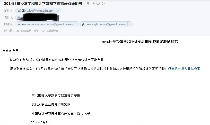 zkb26112 发表于 2014-6-8 11:48 今天收到厦门大学王亚南经济研究院的邮件,说是被他们录取了,可以去这个暑期培训学校。想问问收到邮件的人 ...