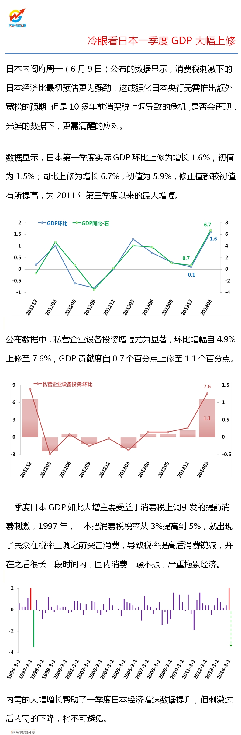 日本内阁府周一(6月9日)公布的数据显示,消费税刺激下的日本经济比最初预估更为强劲,这或强化日本央行无需推出额外宽松的预期,但是10多年前消费税上调导致的危机,是否会再现,