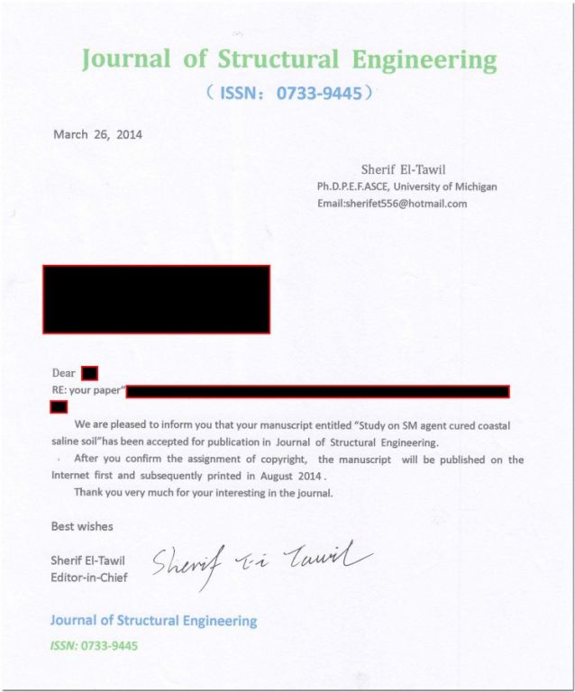 Angela指出这是一家中国学术机构帮助人们想ASCE学会期刊投稿,并承诺在15-20天内给出是否接收的答复。她认为,根据她的推断,作者应该是向这家学术机构缴纳费用的。“It was in Chinese so I had it translated. The memobasically offered a service to help authors get papers into our Journal of Structural Engineering andanother society’s journal on a related topic. The memo instructed authors tosubmit only original papers in English to a specific email address. Thisservice agency, which claimed to have a very longstanding relationship withASCE, would submit the paper on the author’s behalf and would return a decisionletter within 15-20 days.Additionally, if the paper is accepted, the author will receive a copy of thepaper as it appears in the journal. I can only assume that the author paid upfront for thisservice as I cannot fathom any other motivation. The author, likelyembarrassed by being taken advantage of, is no longer responding to queries onthe matter.”