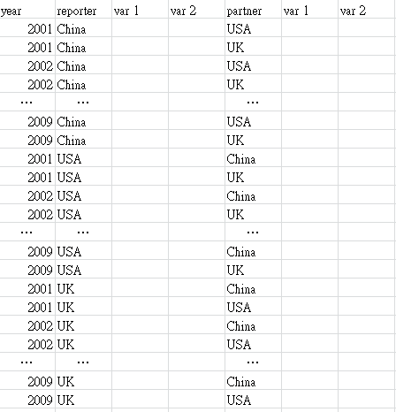 然后我发现在partner下,每个国家都会在同一年都有两组数据,比如说,2001年partner下的UK,同时有和USA和China的两组数据,因为之前设定了以partner和year为变量,stata不会识别reporter的不同。