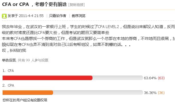 3.再看认可度,东奥会计cpa论坛里,多数人认为cfa比cpa有前途,这和学金融的圈里认为cpa比cfa有用一样,人都有心理偏差,就是觉得容易的不值钱,难的才值钱。所以学金融的看不起cfa,学会计的却认为cfa有前途;