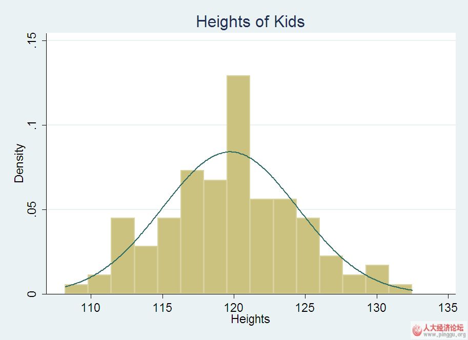 histogram x,bin(15) title(Heights of Kids) xtitle(Heights) ytitle(Density)