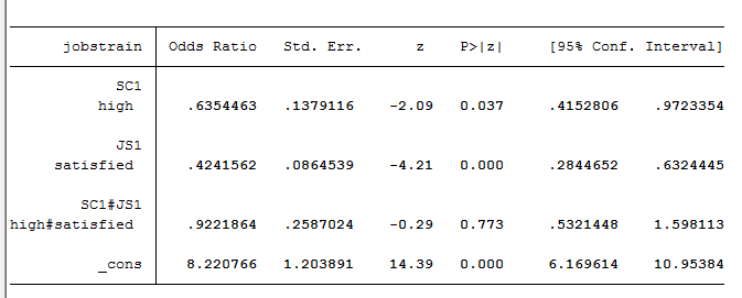 我用 xtmelogit jobstrain i.SC1 i.JS1 i.SC1#i.JS1 || Unit: