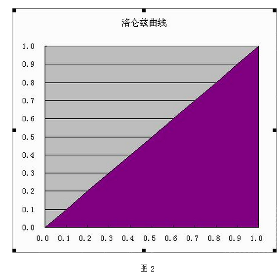 用Excel绘制洛仑兹曲线,主要使用面积图,先绘制绝对平均区域的对角线三角形面积图,并以某显著颜色图案着色。再绘制洛仑兹曲线,选择一个前景色着色,掩盖前者的一部分以后,就可见到月牙形的曲边形,从而为基尼系数的计算做了准备。绘制洛仑兹曲线的步骤如下: