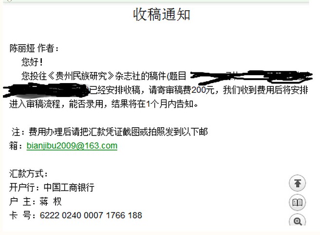 佳佳一号a 发表于 2014-6-25 09:14 假的~不收审稿费的,别信!!