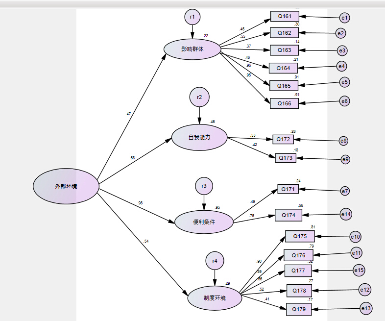 在AMOS 路径分析中,指标不达标,适配度低,根据M.I多次调整还是不行。输出的路径图和几个model fit 如下,请高人指点。论文想分析几个外部环境因素对公众参与行为的影响,李克特量表收集到的数据表明Q161、Q164得分高,影响大,但是路径系数却显示较小。另外,可以不用AMOS路径分析,只用SPSS做因子分析,能得出各影响因素对公众参与行为的影响的结果吗?因子分析是最后提取几个公共因子就结束了吗?