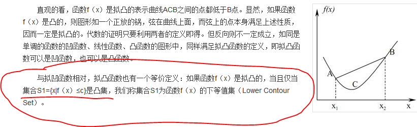 PAROIEC 发表于 2014-7-8 08:40 这个c是指任意给定的一个值域内的数。即在右图任意画一水平线,投影下来的对应的x集都是凸集的话,则函数 ...