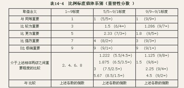 (三)层次分析法 层次分析法又称AHP构权法(Analytic hierarchy process,简写为AHP),是将复杂的评价对象排列为一个有序的递阶层次结构的整体,然后在各个评价项目之间进行两两的比较、判断,计算各个评价项目的相对重要性系数,即权重。AHP 构权法又分为单准则构权法和多准则构权法,在此介绍单准则构权法及具体步骤。1.确定指标的量化标准。 层次分析法的核心问题是建立一个构造合理且一致的判断矩阵,判断矩阵的合理性受到标度的合理性的影响。所谓标度是指评价者对各个评价指标(或者项目)重要性等级差异的量化概念。确定指标重要性的量化标准常用的方法有:比例标度法和指数标度法。比例标度法是以对事物质的差别的评判标准为基础,一般以5种判别等级表示事物质的差别。当评价分析需要更高的精确度时,可以使用9种判别等级来评价,见表14-4