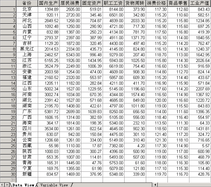 有了对各个公因子的合理的解释,结合各个城市在三个公因子的得分和综合得分,就可对各城市的经济发展水平进行评价了。在投入产出因子f1上得分最高的6个城市是山东、江苏、广东、河北、四川。其中山东得分为2.11763,江苏得分为2.03281,高于其他城市,说明山东、江苏的工业的投入产出能力最高,工业发展相对较快,从而推动城市发展;而青海、宁夏、海南、西藏的投入产出能力较差,可能由于地理位置的缘故工业发展相对落后。上海、广东、北京、天津在消费能力因子f2上的得分较高,说明它们的消费能力较高,人们的收入也较高,从而生活质量较好,城市发展较快;而河南、河北得分较低,它们的消费能力较低,从而说明人们的收入也相对较低,生活质量相对差一点,城市发展较慢。云南、贵州、湖北、新疆在价格指数因子f3上的得分较高,说明在这些城市物价相对较高,可能以些非本地产的东西由于运输的不方便,使得这些物价相对较高,而广东、安徽、天津、海南的价格指数较低,说明,在这些城市,交通相对便捷,运输方便,或者本地产的东西较多基本满足需求,使得物价相对较低,但从侧面也可看出这些城市与其他城市的联系可能较少,不利于自己的总和发展,从而也说明了这些城市的发展相对较慢。由综合因子f的分就可综合评价城市的经济发展水平,综合得分的前3名上海、山东、江苏,得分最低的3个城市安徽、宁夏、海南