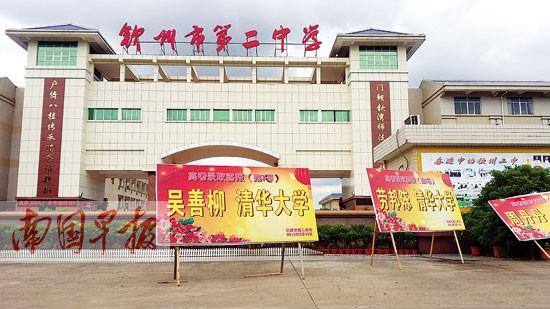 7月15日下午3时,南国早报记者来到钦州二中,校门外摆着一个宣传牌,上写“高考录取喜报,吴善柳,清华大学”等字样。记者在钦州市外国语学校门口也看到这种宣传牌。