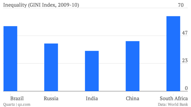 基尼系数显示,金砖国家内部收入分配不平衡。该系数逾趋向于零,说明收入分配越平衡。从这点看,印度较其他国家要好。