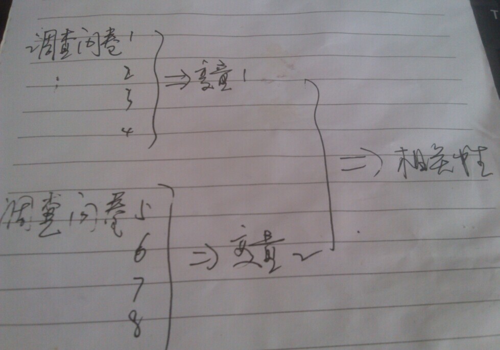 问卷调查得来的变量1和变量2本来就是抽象出来的,研究二者之间的相关性,其实还不是就是研究这两个变量所包含的子变量之间的相关性,典型相关分析就是分析两组变量之间相关性的 一种统计方法,它将一组变量与另一组变量之间单变量的多重共线性相关性研究转化为对少数几对综合变量之间的简单线性相关性的研究。