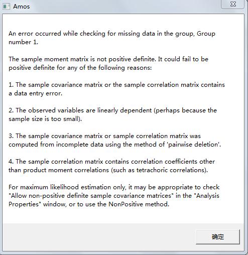 路径图画好,路径系数设定为1,双箭头共变关系绘制好,spss数据关联好,点击calculate estimates,出错,提示如下: