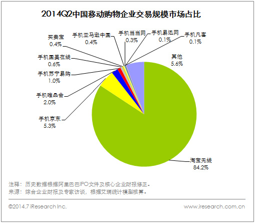 2014Q2淘宝无线在中国移动购物市场中占比达84.2%,领先优势明显
