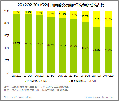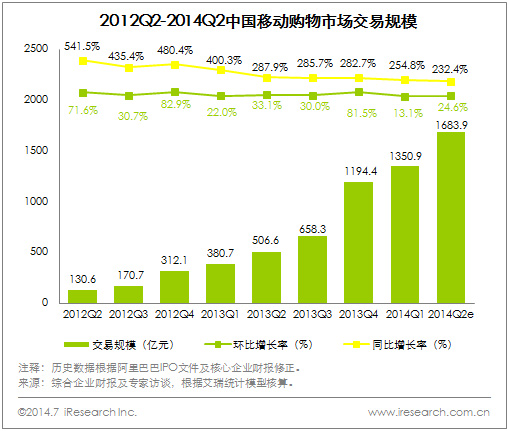 2014Q2中国移动购物交易规模达1683.9亿元,移动端交易额占比达到26.8%